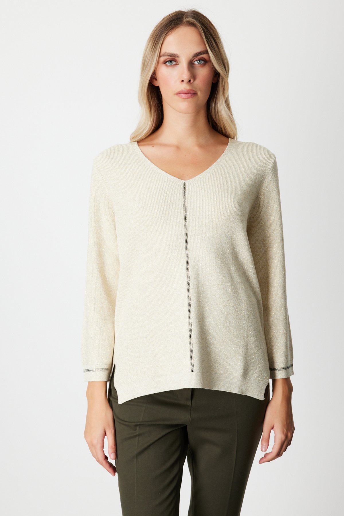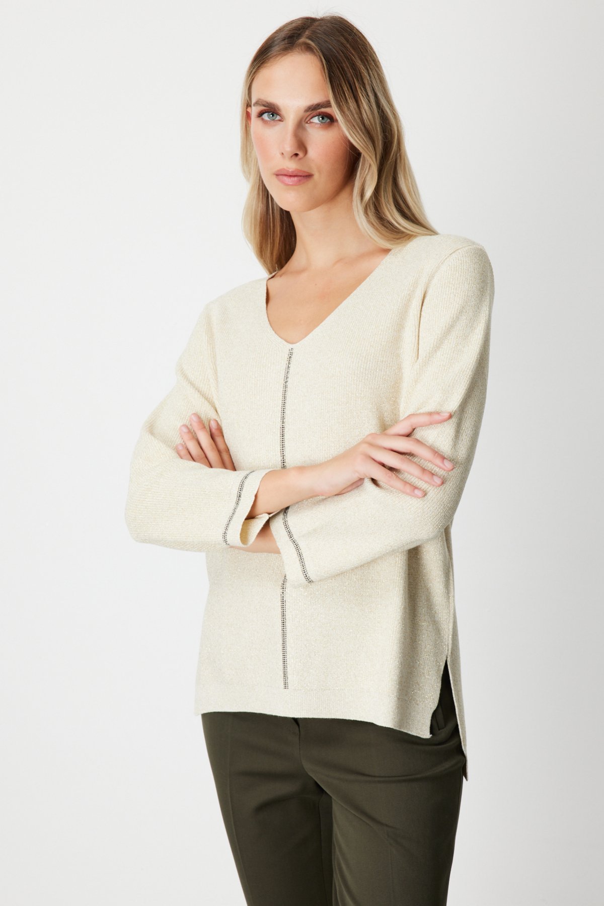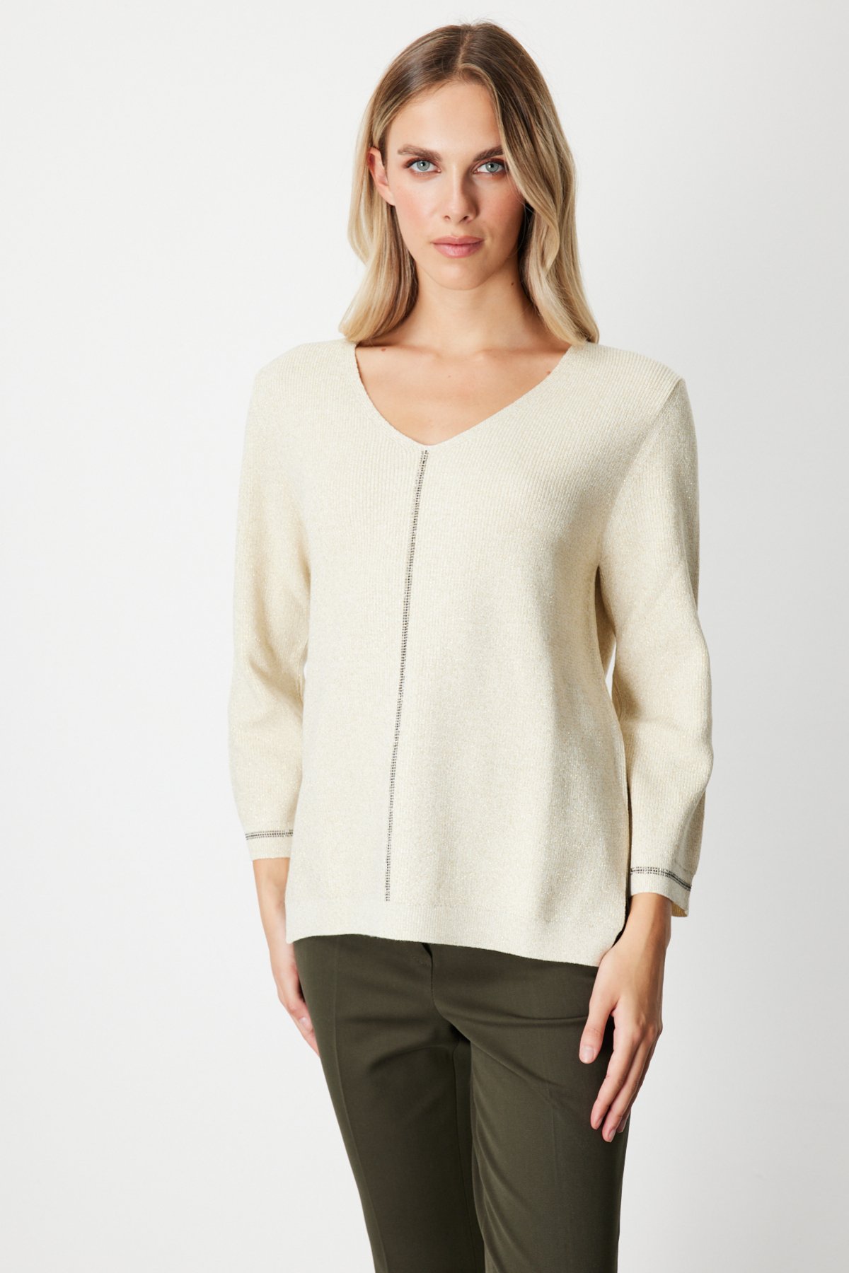 ON TRİKO Simli Kumaş Taş İşlemli Triko Kazak 65326 Ekru