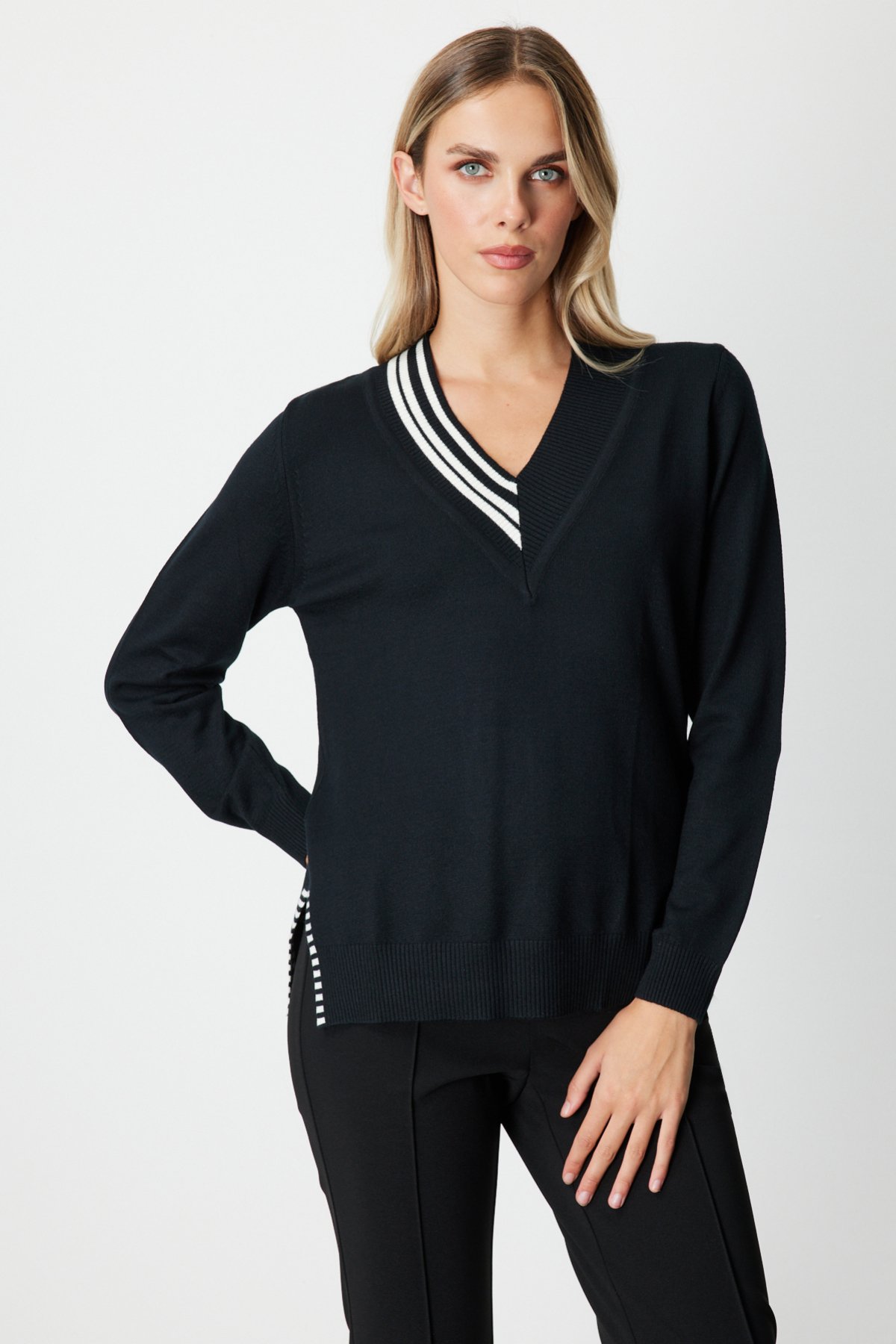 ON TRİKO V Yaka Yakası Ribanalı Kazak 65378 Siyah