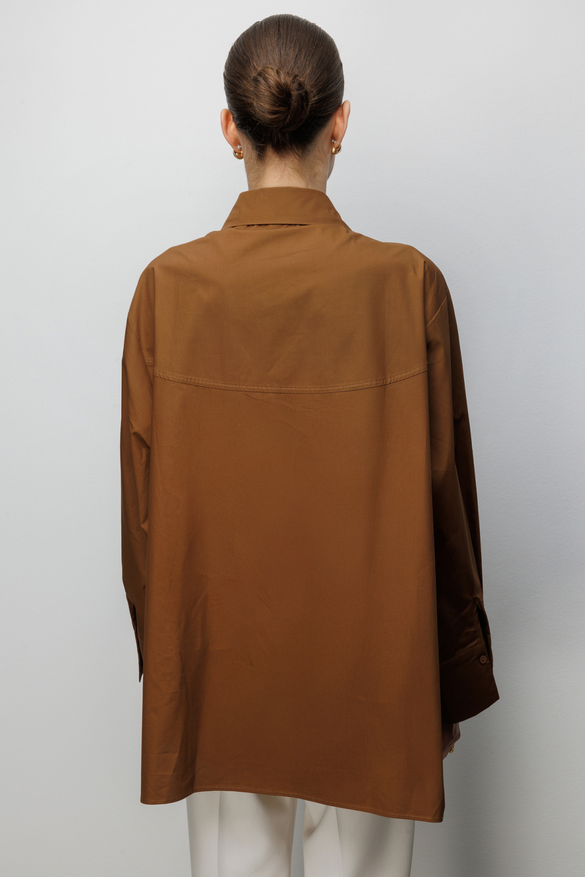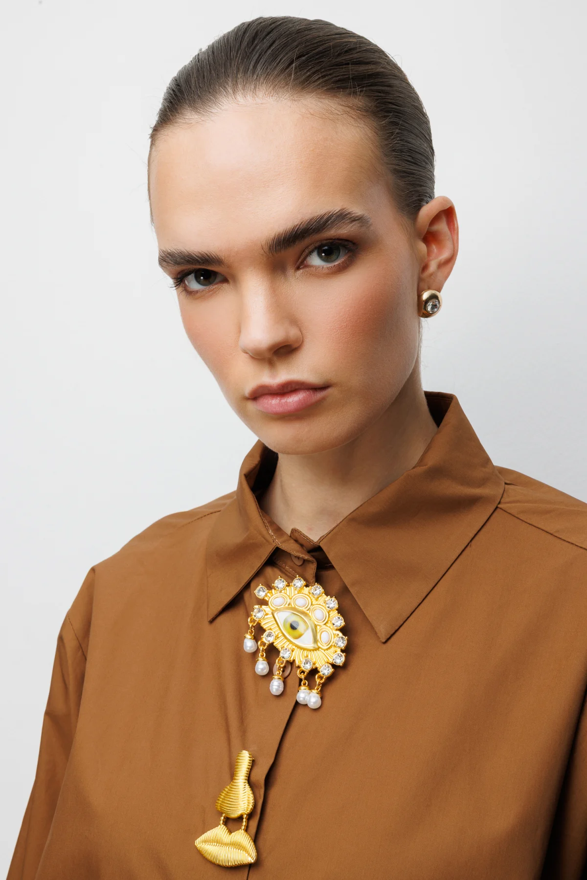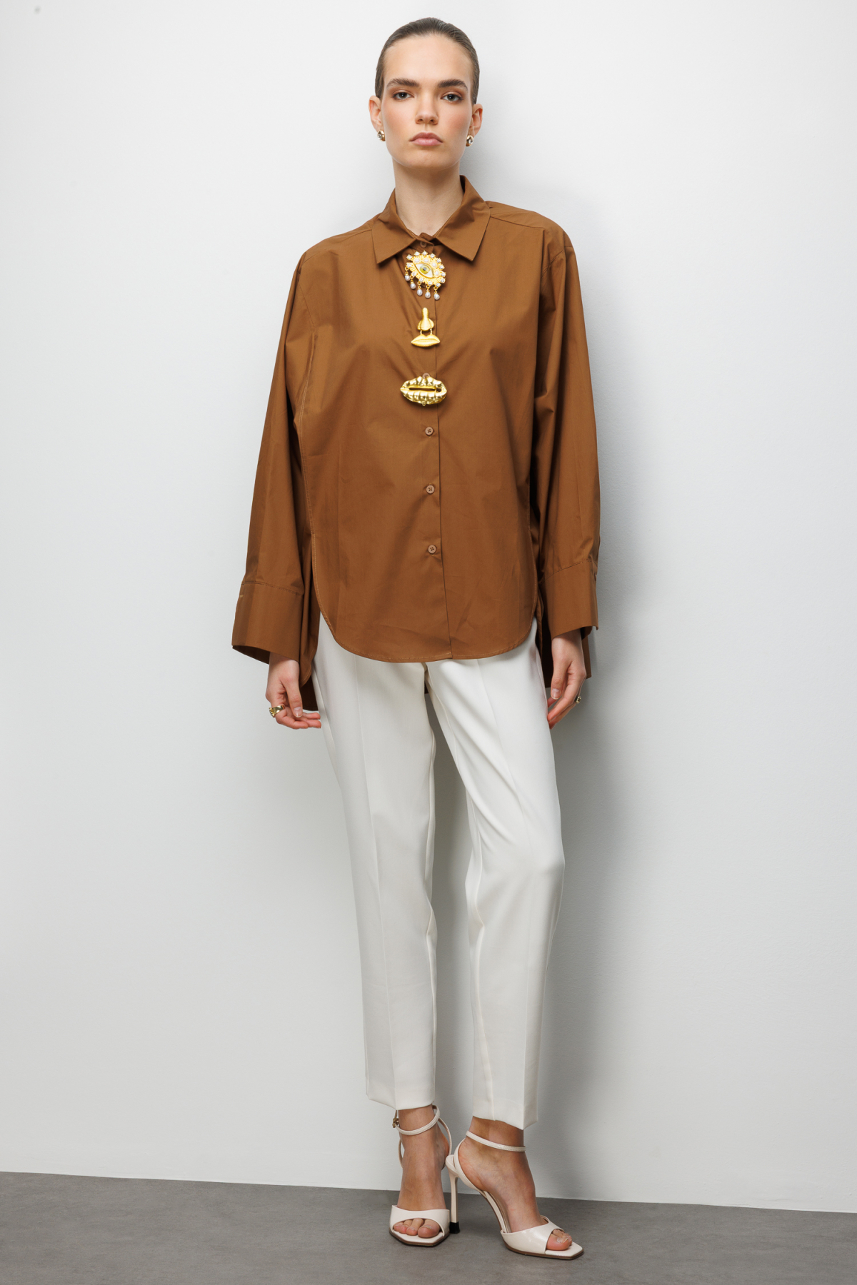 EKOL Metal Broşlu Oversize Pamuk Gömlek 2822 Kahve
