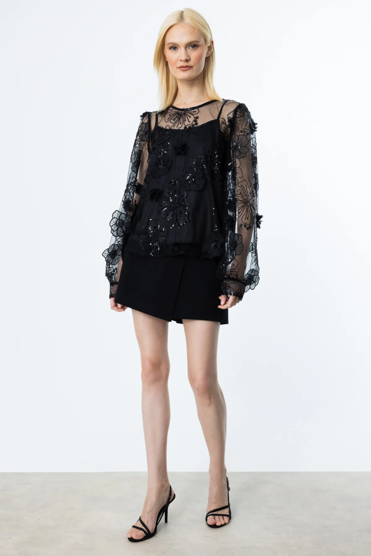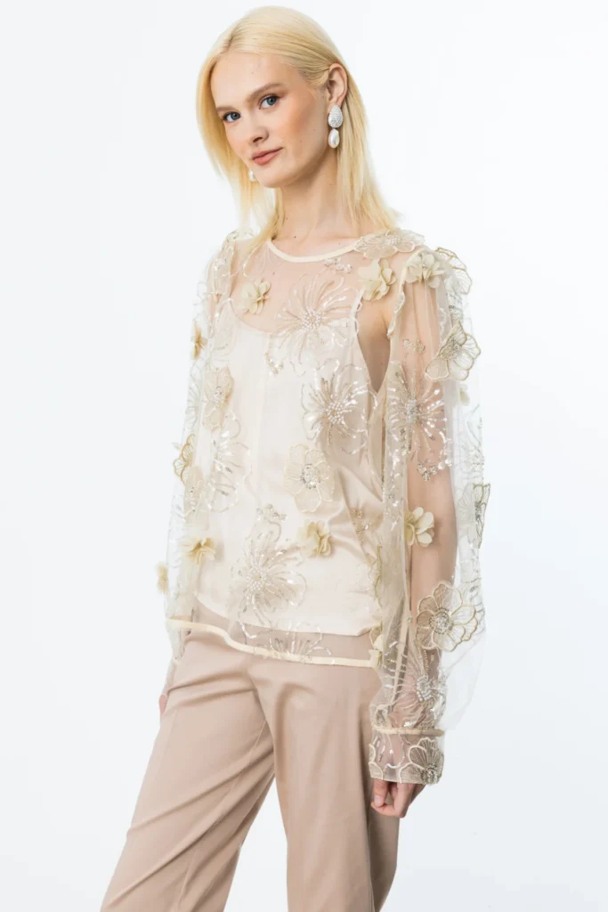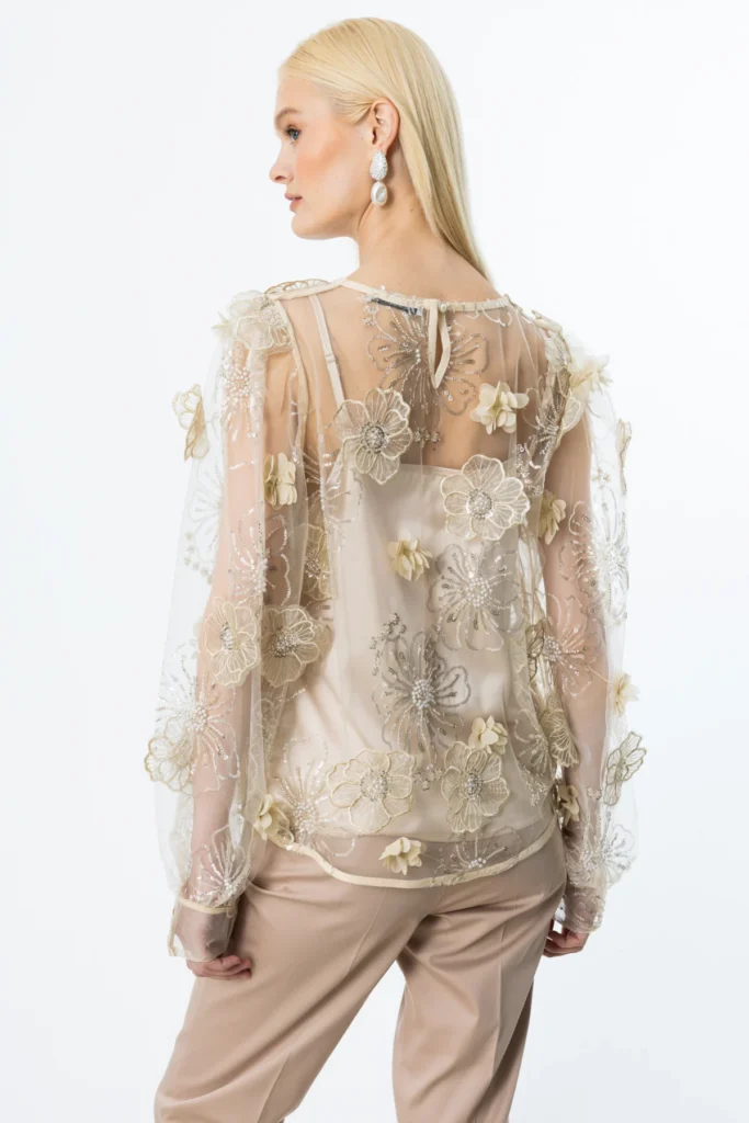Ürün Özellikleri: Sıfır yaka, uzun kollu, tül, iç atletli, pul çiçek işlemeli, arkası düğme kapamalı