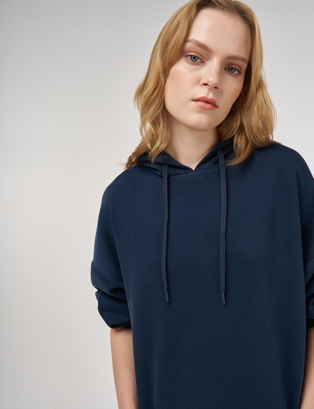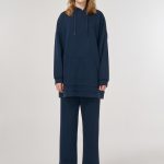 Bağcıklı kapüşonlu, düşük omuz, kanguru cepli sweatshirt. Lastikli yüksek bel, yanlardan cepli pantolon. Sweatshirt ve pantolondan oluşan ikili takımdır.
