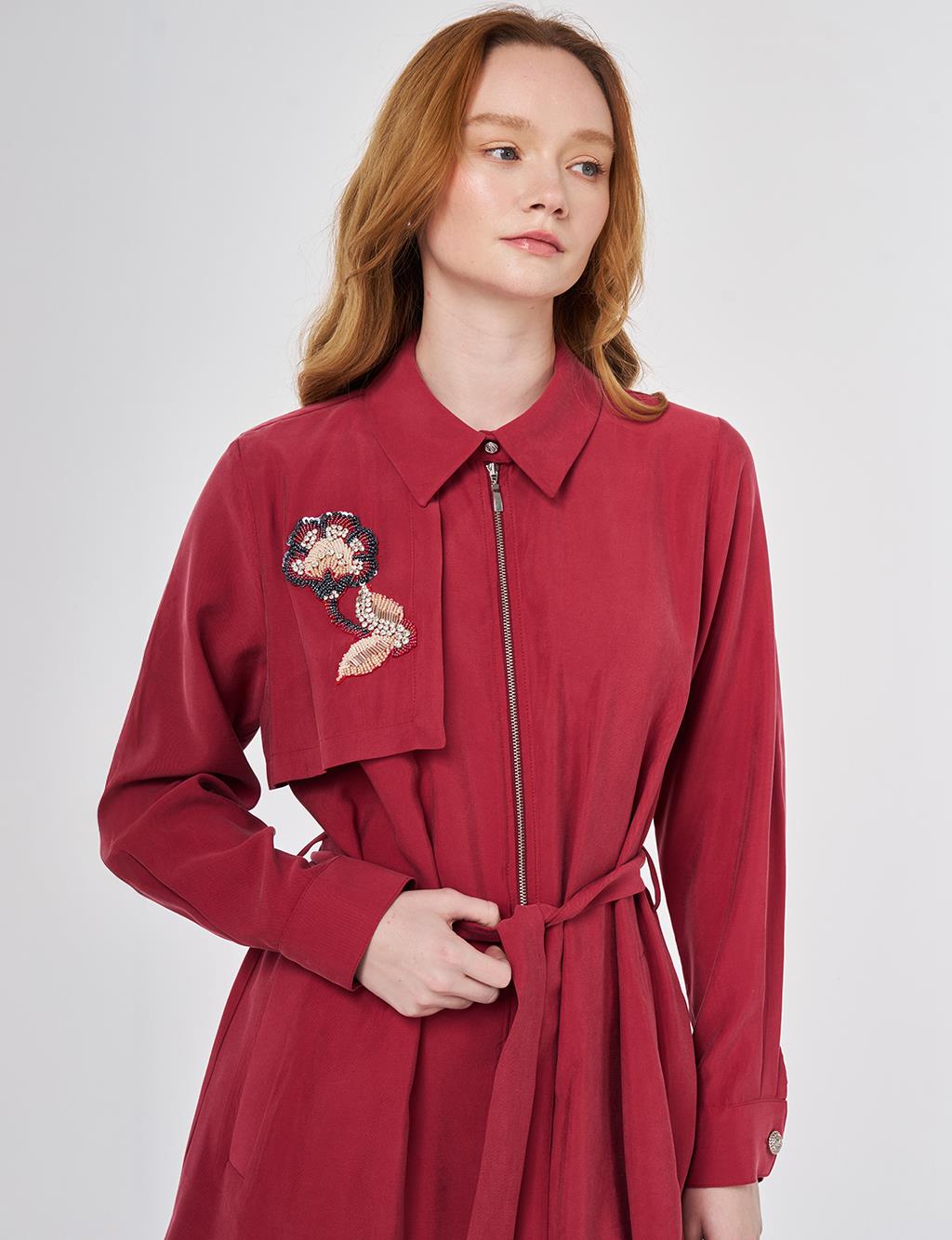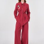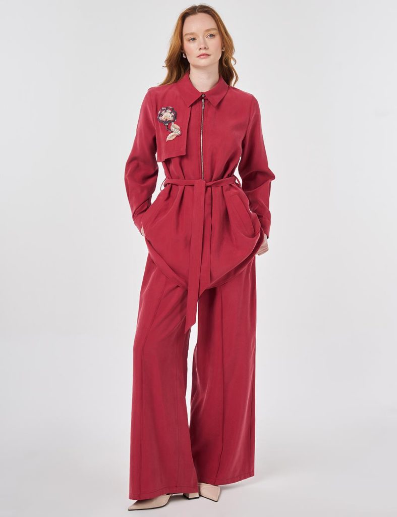 Gömlek yaka, fermuar kapamalı, kuşaklı, yanlardan cepli, pileli manşetli tunik. Lastikli yüksek bel, bağcıklı, çima dikişli, yanlardan cepli, geniş paça pantolon. Tunik ve pantolondan oluşan ikili takımdır.