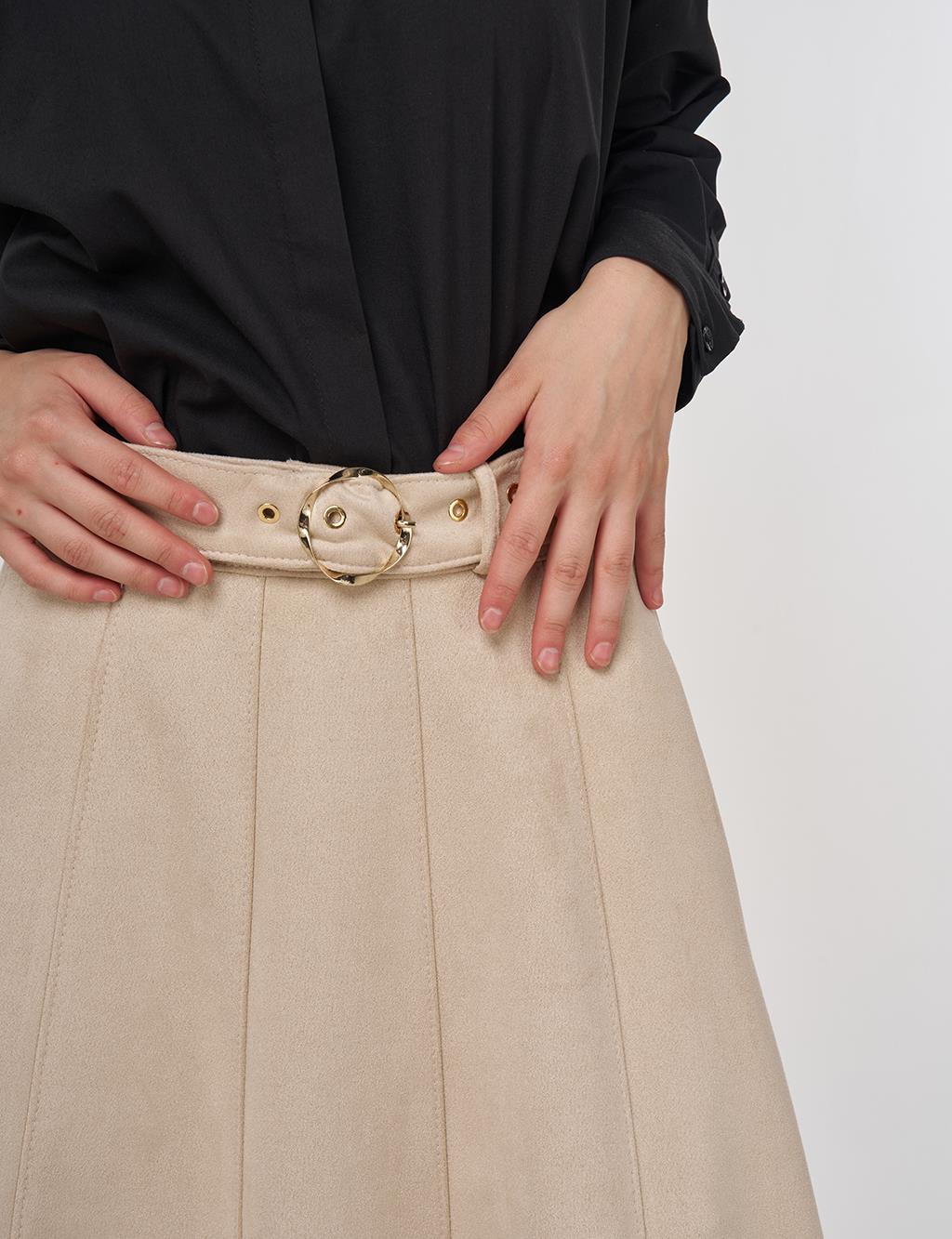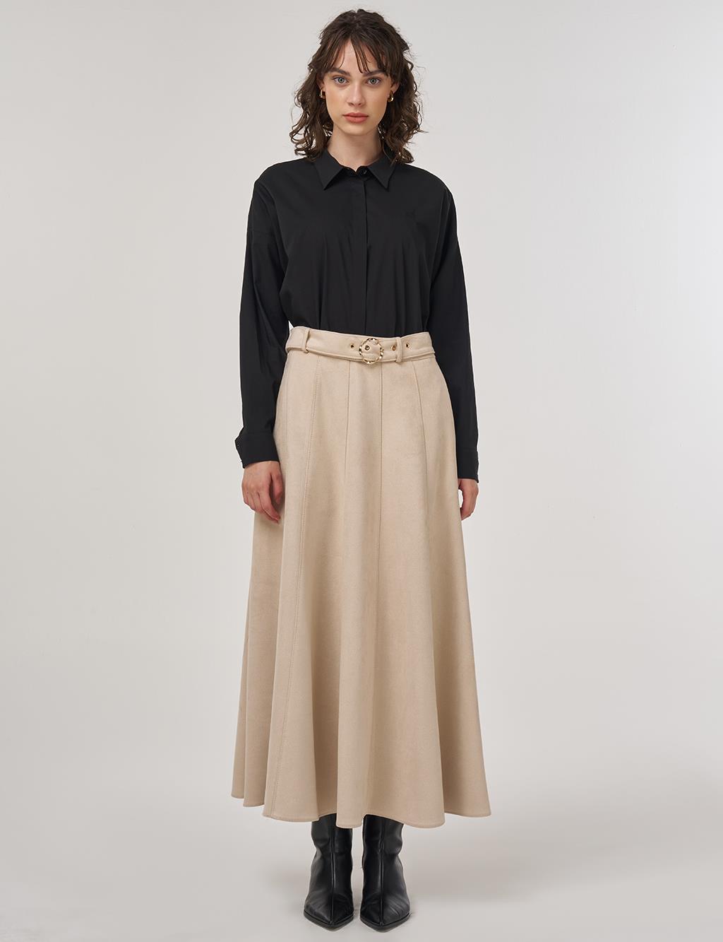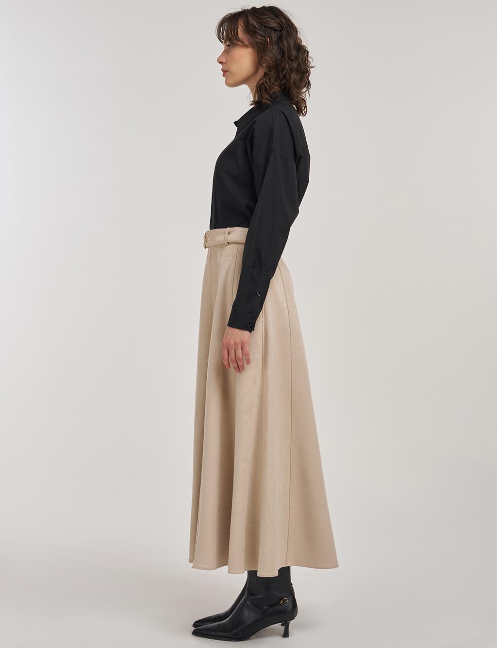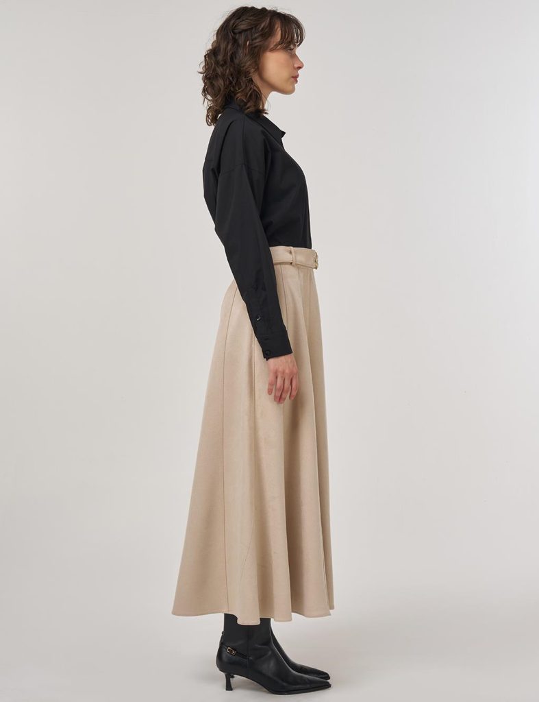 Kayra Kemerli Süet Kloş Etek, modern tasarımı ile dikkat çekmektedir. Sonbahar-kış sezonunun vazgeçilmez parçası olan süet eteği; ofis ya da günlük stillerinizde tercih edebilirsiniz. Triko kazak, basic gömlek ya da küpeler ile destekleyebilirsiniz.