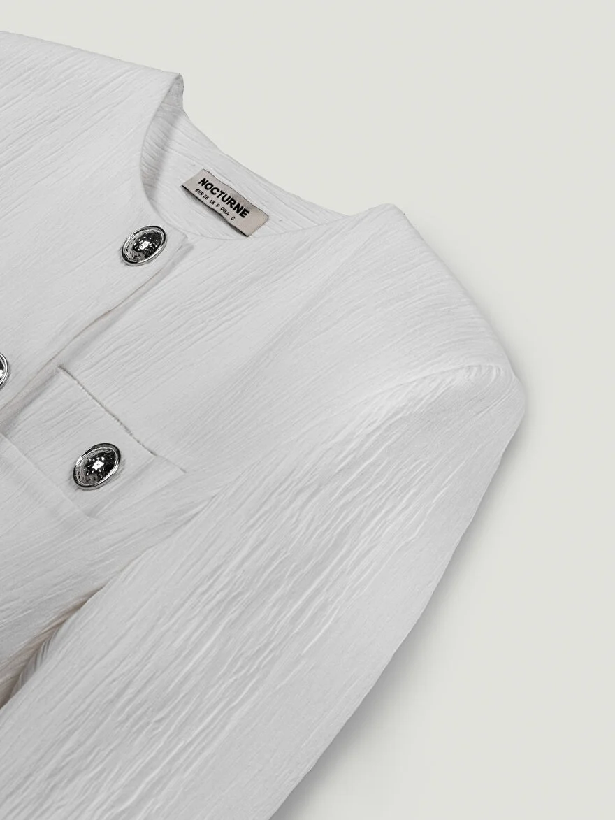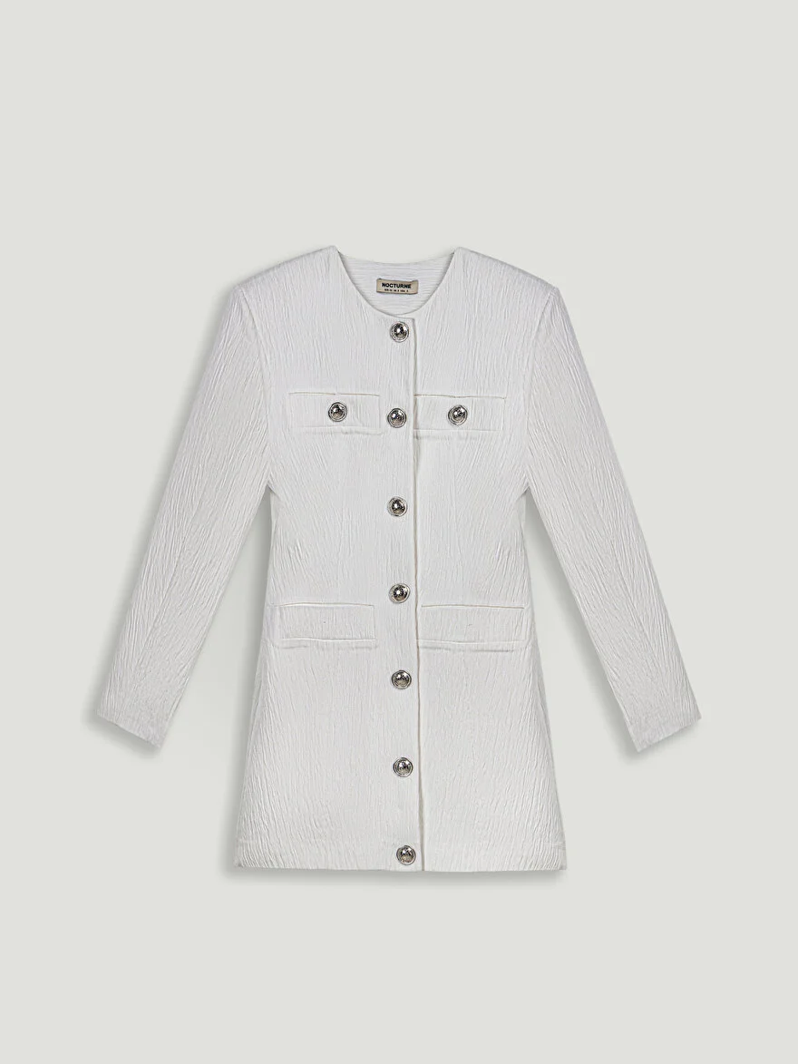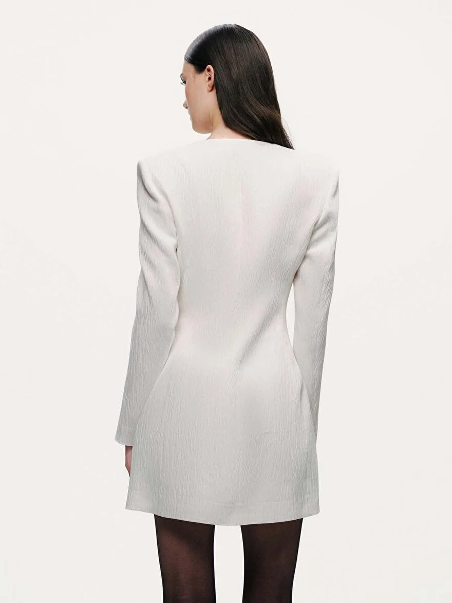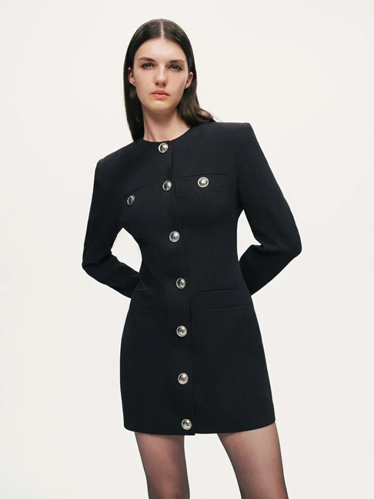 Cesur ama zamansız bir parça olan bu dolgulu omuz mini elbise, örgülü kumaştan üretilmiştir ve normal kesim ve dolgun astarı ile yapılandırılmış bir silüet sunar. Uzun kollu, klasik bisiklet yaka ve önden çıtçıtlı düğmeli tasarımıyla konfor ve modern bir havayı bir araya getirir. Mini boy ve omuz dolgusu, zarif bir görünüm sunarak hem gündüz hem de gece için mükemmel bir seçimdir.