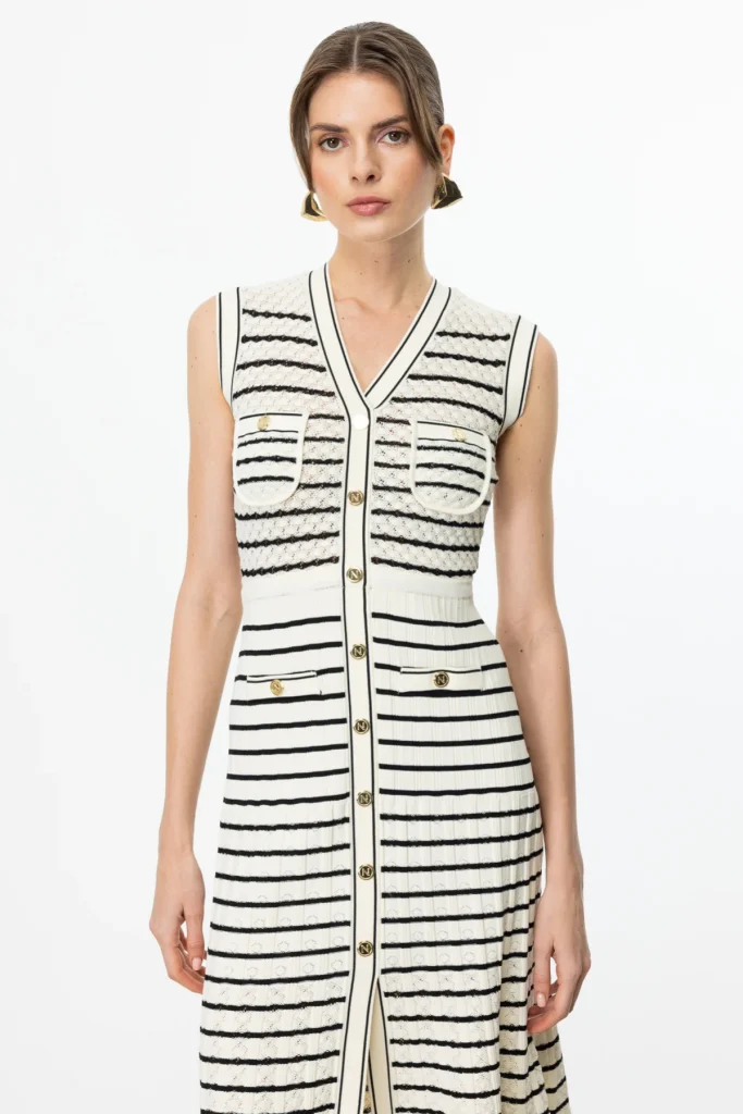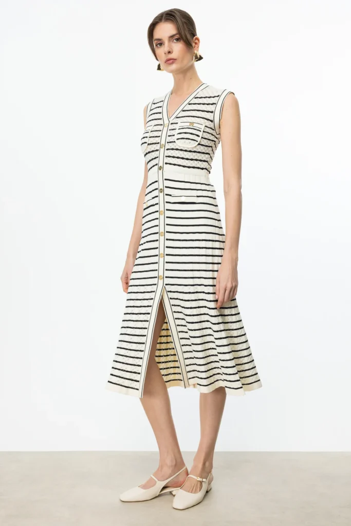 Ürün Özellikleri: V yaka, kolsuz, triko kumaşlı, diz altı, çizgi desenli, süs düğmeli, süs cepli